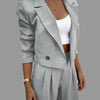 The Nadia suit set blends modern lines with practical design for both business and social settings. The blazer features a single-button front with a clean silhouette, while the matching trousers provide balance with their straight-leg cut. Available in dark blue and grey, this set can be styled with shirts, blouses, or knitwear for a polished look.